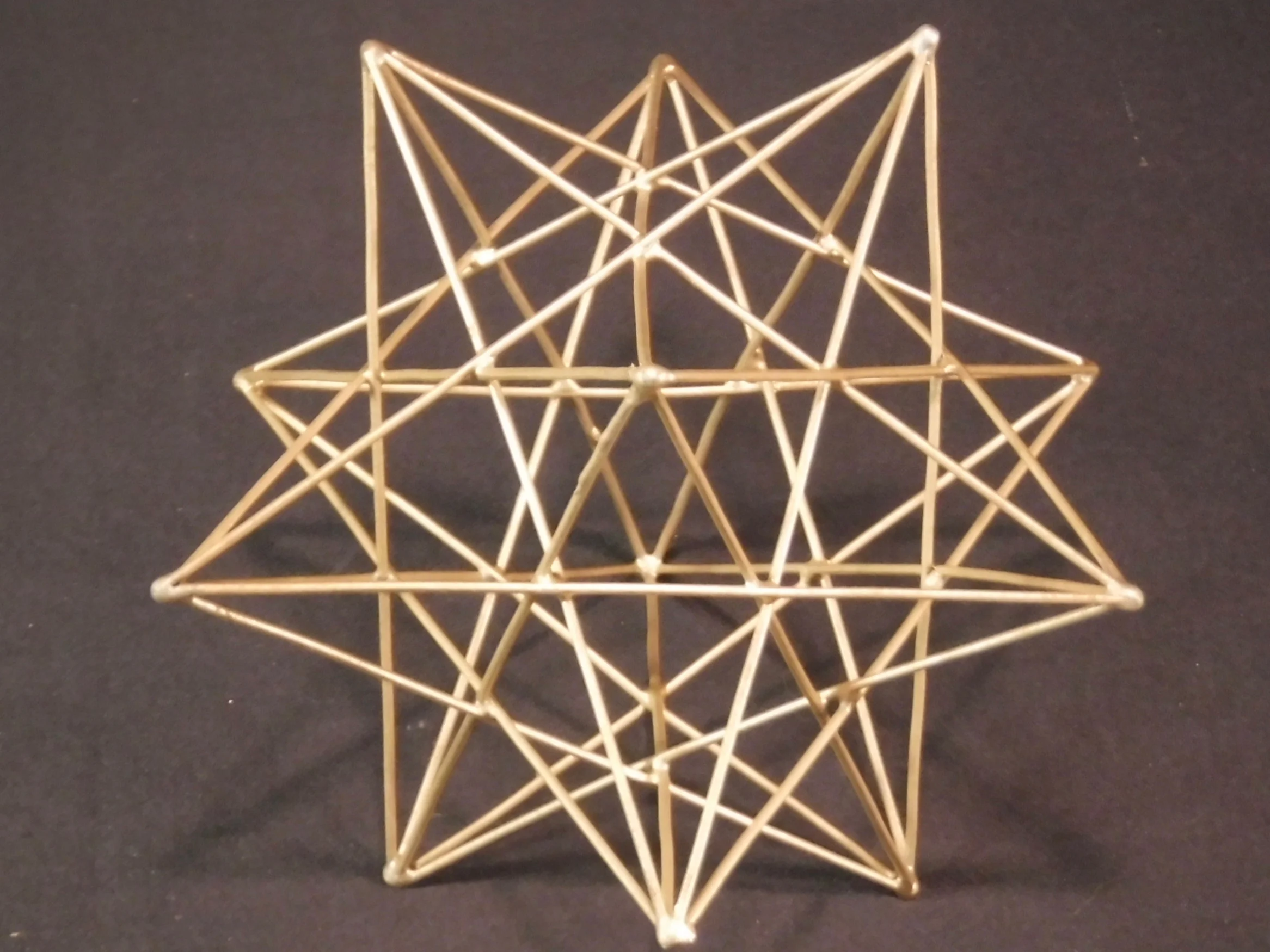 A cube and octahedron are fit together, made with wire wrapped bamboo, and a cube octahedra is made with yellow yarn, and a rhombic dodecahedra is defined with purple yarn. Three light sources cast three shadows on the wall. I have used original techniques to make this unique creation. I have almost as many original joke puns as days of the year, and this is one of them!